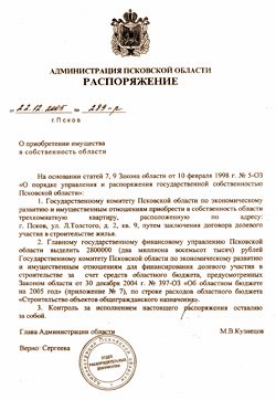 13 января в распоряжение редакции попало распоряжение администрации Псковской области № 289-р «О приобретении имущества в собственность области», подписанное Михаилом Кузнецовым 22 декабря 2005 года.