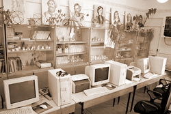 Поразило многое другое: кабинет математики и информатики – большой, светлый, с тремя рабочими компьютерами, рукописными портретами великих физиков и математиков. «Кто у вас рисует, то есть пишет?» - спросила я, рассматривая уже почти «монументальное» полотно с Пушкиным на «онегинской» скамье в соседнем кабинете литературы. Оказалось, что директор школы, она же учитель математики, Заслуженный учитель России Светлана Федоровна Яковлева.