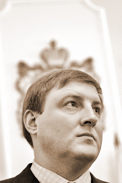 | Пятый губернатор Псковской области Андрей Турчак привыкает к новым геральдическим знакам. Фото: Александр Сидоренко |