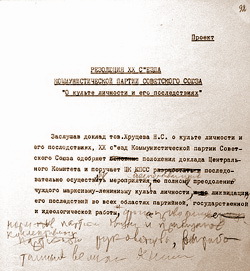 | Проект постановления ХХ съезда КПСС «О культе личности и его последствиях». |