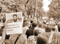 Обгоняю парня в белой рубашке. Он с отрешенным видом несет плакат: «Вам мало «приморских партизан»»? Вы хотите подмосковных?»